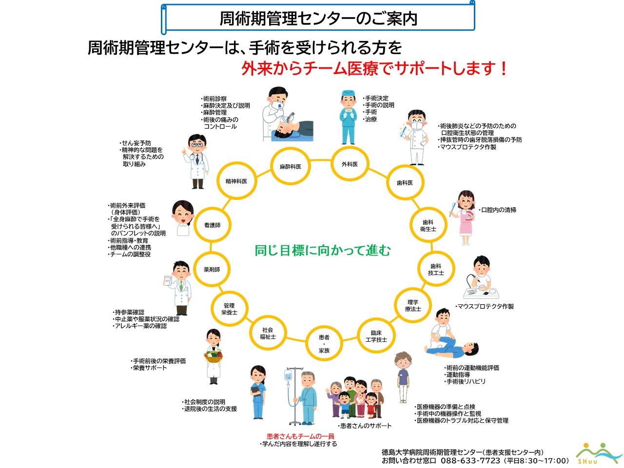 このような背景の中、周術期管理センターは、徳島大学病院における周術期管理について組織横断的に業務を行い、手術を受ける患者さんに対して、快適で安全・安心な医療を効率的に提供し周術期の患者管理の質向上と患者満足度を高めることを目的に2019年度新たに設置されました。