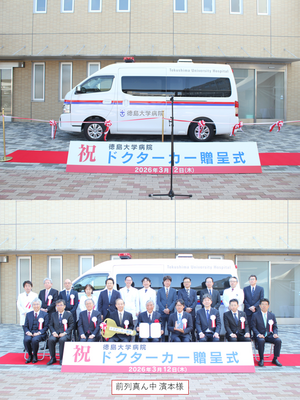 We are pleased to announce that we have received a donation of one medical emergency vehicle from Mr. Tsuneo Hamamoto (a graduate of the Tokushima University School of Medicine and Director of Minami-Aoyama Hidamari Clinic). A presentation ceremony was held on March 12, 2026, attended by approximately 30 representatives from Tokushima University, including Mr. Hamamoto and President Kawamura.