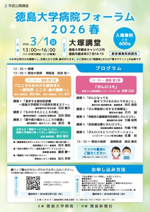 イベント案内 市民公開講座「徳島大学病院フォーラム2026春」を開催します 徳島大学病院では、県民の健康の増進と医療に対する意識の向上の一助になることを目的に2007年から毎年「徳島大学病院フォーラム」を開催しております。 本年は「認知症・こころ・歯の健康」と「がんロコモ」をテーマに、3月1日(日)に開催いたします。 詳細、お申込方法については下記のページをご覧下さい。 市民公開講座「徳島大学病院フォーラム2026春」