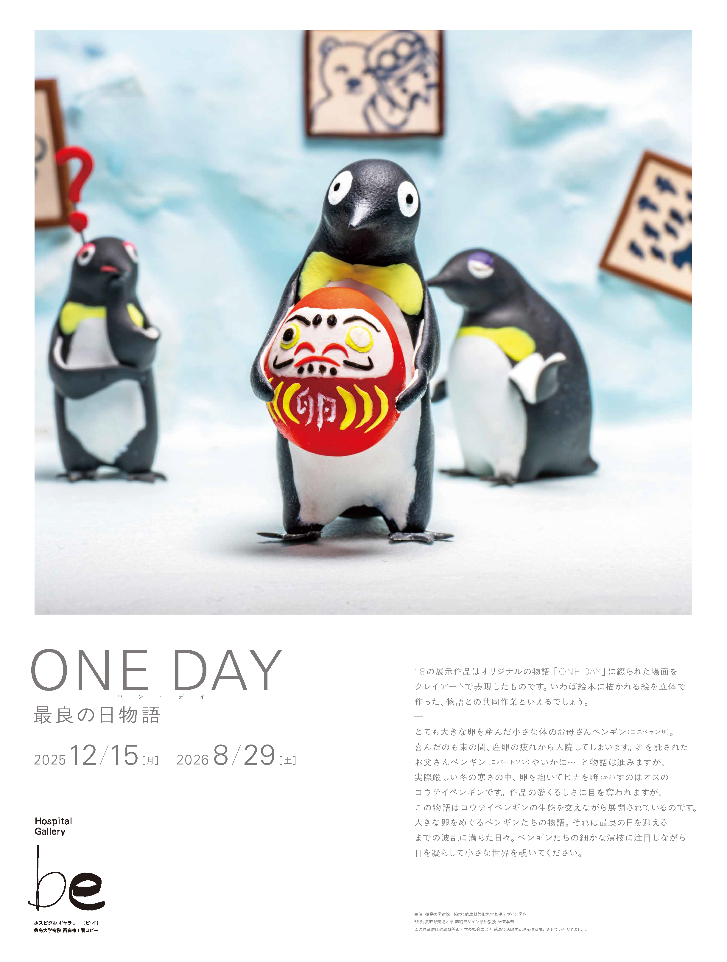イベント案内 【開催中】ギャラリーbe「ONE DAY 最良の日物語」 当院西病棟1階ロビー:ホスピタルギャラリーbeにて県内作家 原田拓史氏によるクレイアート展「ONE DAY 最良の日物語」を開催しております。ぜひお立ち寄りください。 「ONE DAY 最良の日物語」 ★日時:2025年12月15日(月)~2026年8月29日(土) ★場所:ホスピタルギャラリーbe(西病棟1階ロビー) ★協力:原田拓史氏、武蔵野美術大学