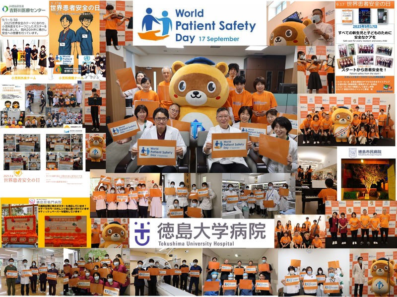 In conjunction with “World Patient Safety Day: Project 2025”on September 17 (Wed.), the Hospital collaborated with various entities in Tokushima Prefecture to raise public awareness by lighting up buildings (Tokushima University Hospital, Tokushima Prefectural Central Hospital, Japan Red Cross Tokushima Hospital, Tokushima Municipal Hospital, Tokushima Prefectural Nursing Association, Washi-no-mon of Tokushima Castle, and the Tokushima Prefectural Office) and by posting posters and distributing pamphlets.