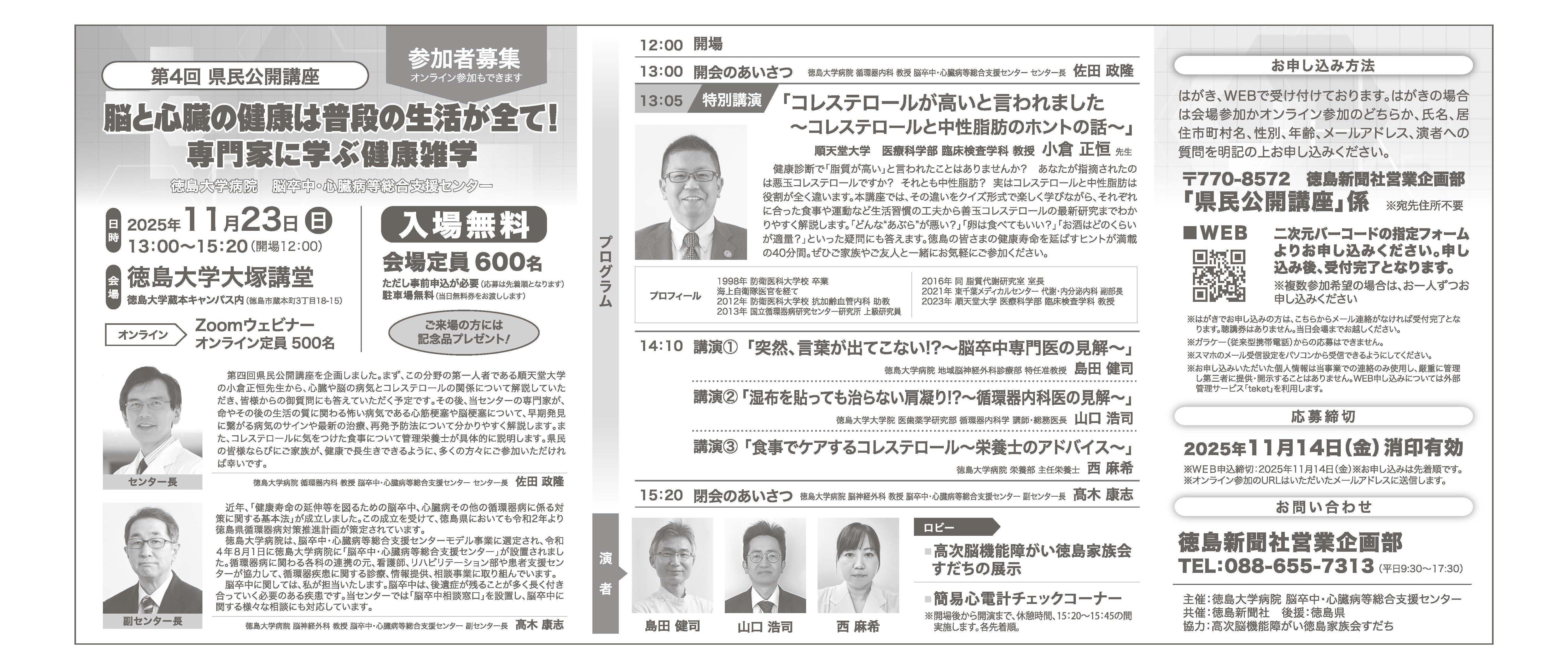 【はがき】〒770-8572 徳島新聞社 営業企画部「県民公開講座」係 ※宛先住所不要