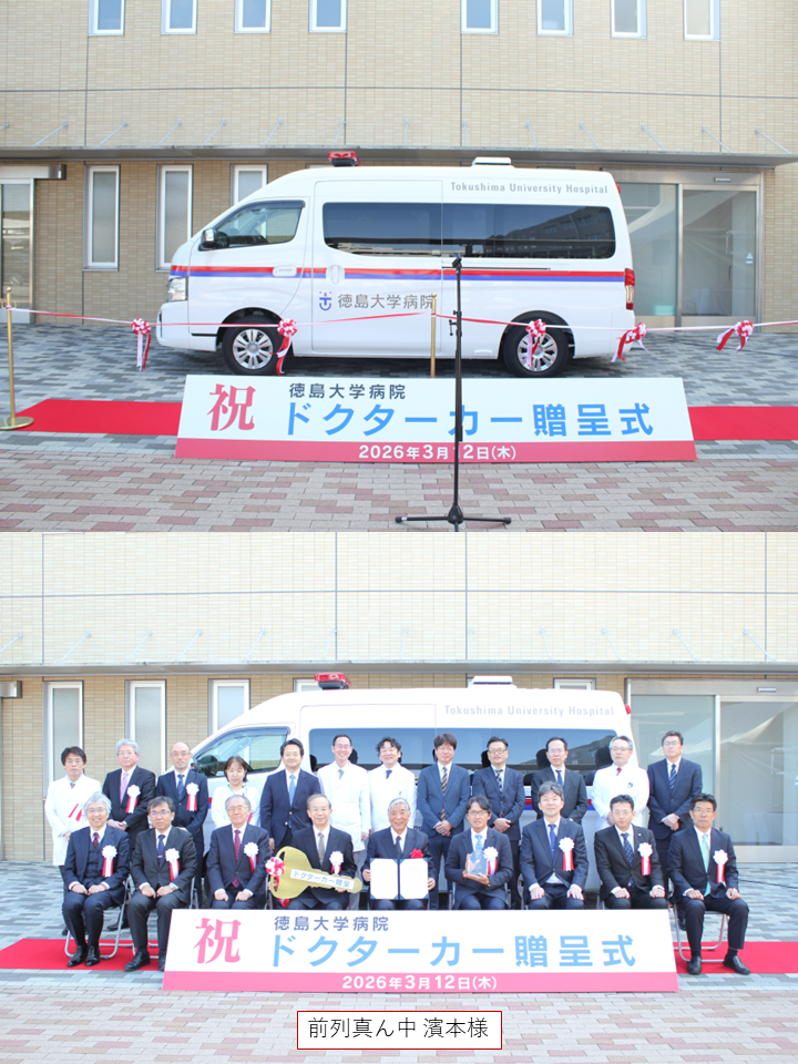 このたび、濱本恒男様(徳島大学医学部卒、南青山ひだまりクリニック院長)よりドクターカーを1台寄贈いただき、令和8年3月12日に濱本様及び河村学長を始めとする徳島大学関係者約30名が出席し、贈呈式を執り行いました。